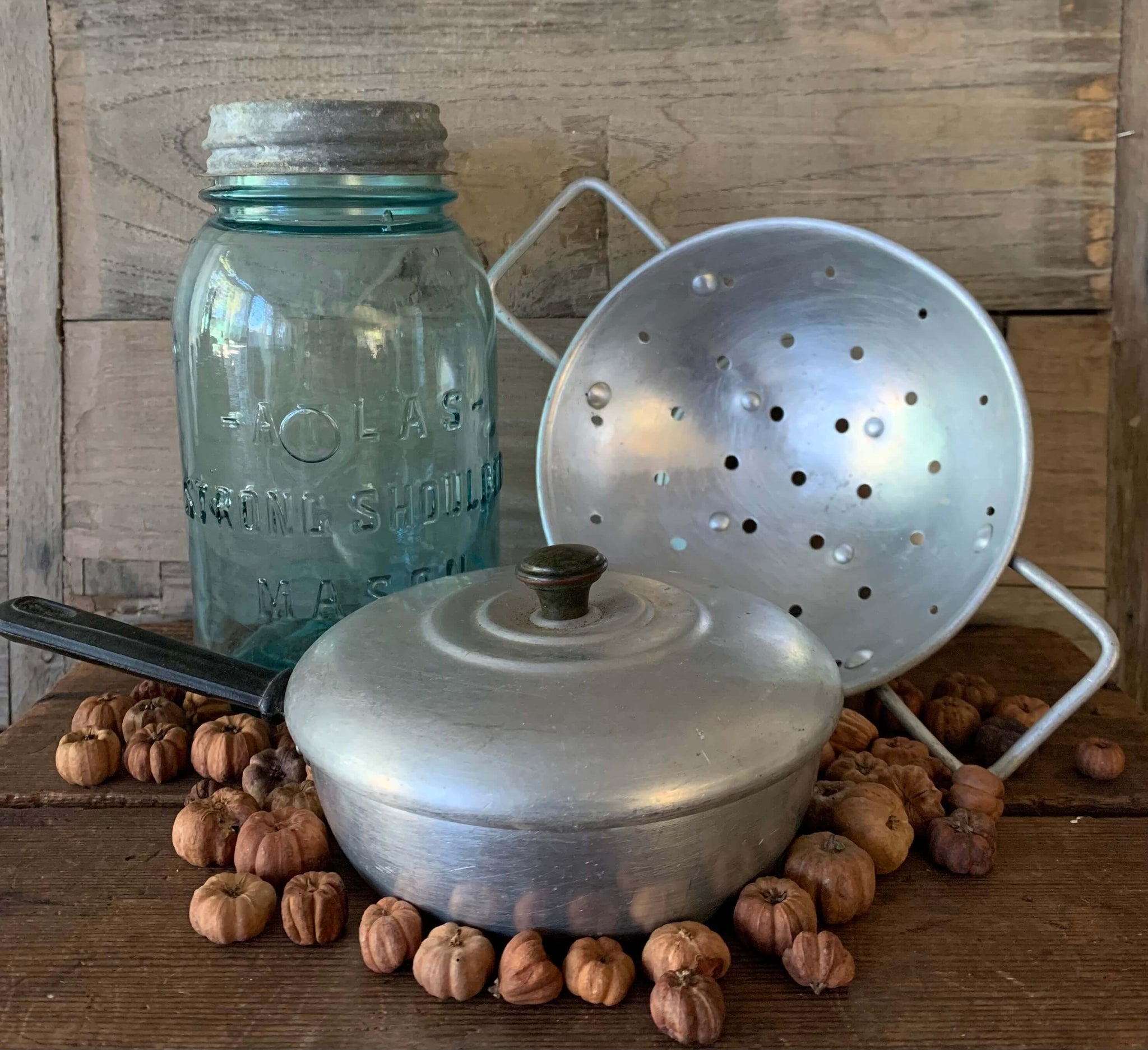 Beautiful early Australian made child's toy aluminium Colander and lidded saucepan/frypan.