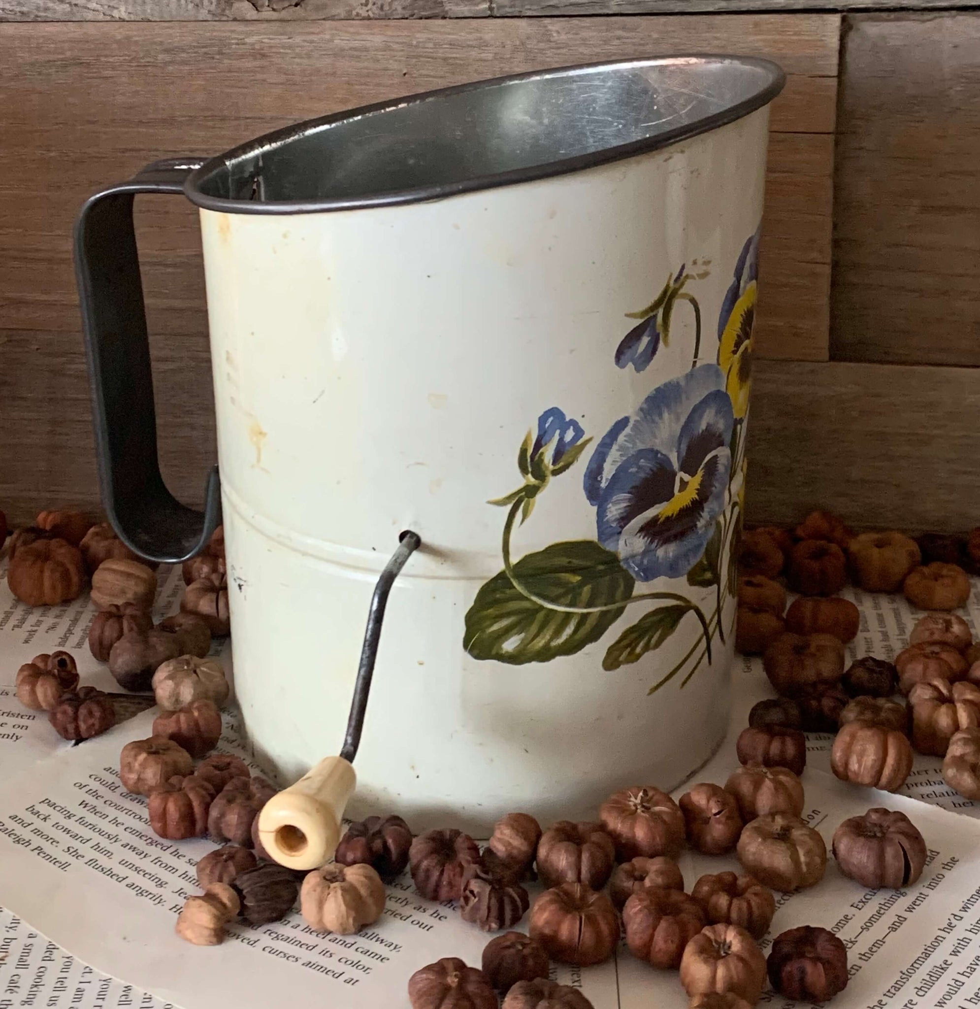 Lovely old sturdy metal WILLOW brand vintage sifter, perfect for that vintage or farmhouse kitchen display. It is cream in colour and features beautiful vintage pansies.